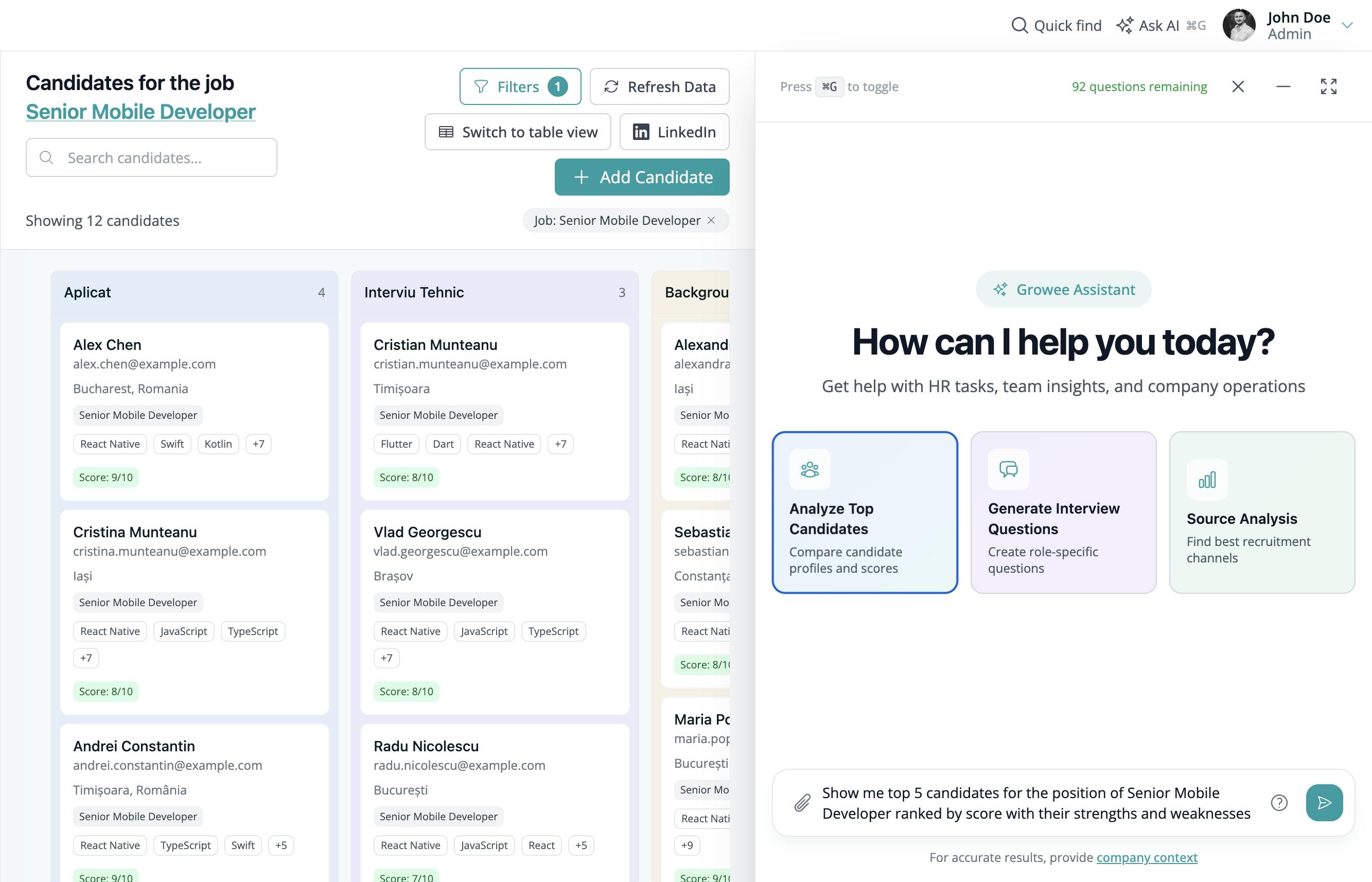 Tools like Growee are designed specifically for this kind of balance. In the Hiring + AI module, recruiters can simply ask, “Show me the top 5 candidates for Senior Mobile Developer,” and Growee Assistant instantly reviews the pipeline, ranks the best matches, and returns clear, structured summaries for each person - stage, location, expected salary, availability, strengths, and potential risks. Recruiters stay in control of the decision, but they no longer spend hours manually scanning cards and notes to build a shortlist. These screenshots are just a small peek at how teams can hire smarter without losing the human connection that actually wins great talent.
