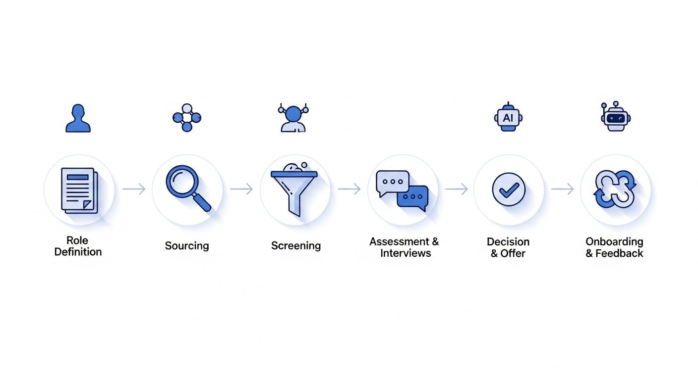 Human judgment remains paramount for the final decision while AI provides organized data to inform that judgment. Once complete, focus shifts to onboarding and learning.