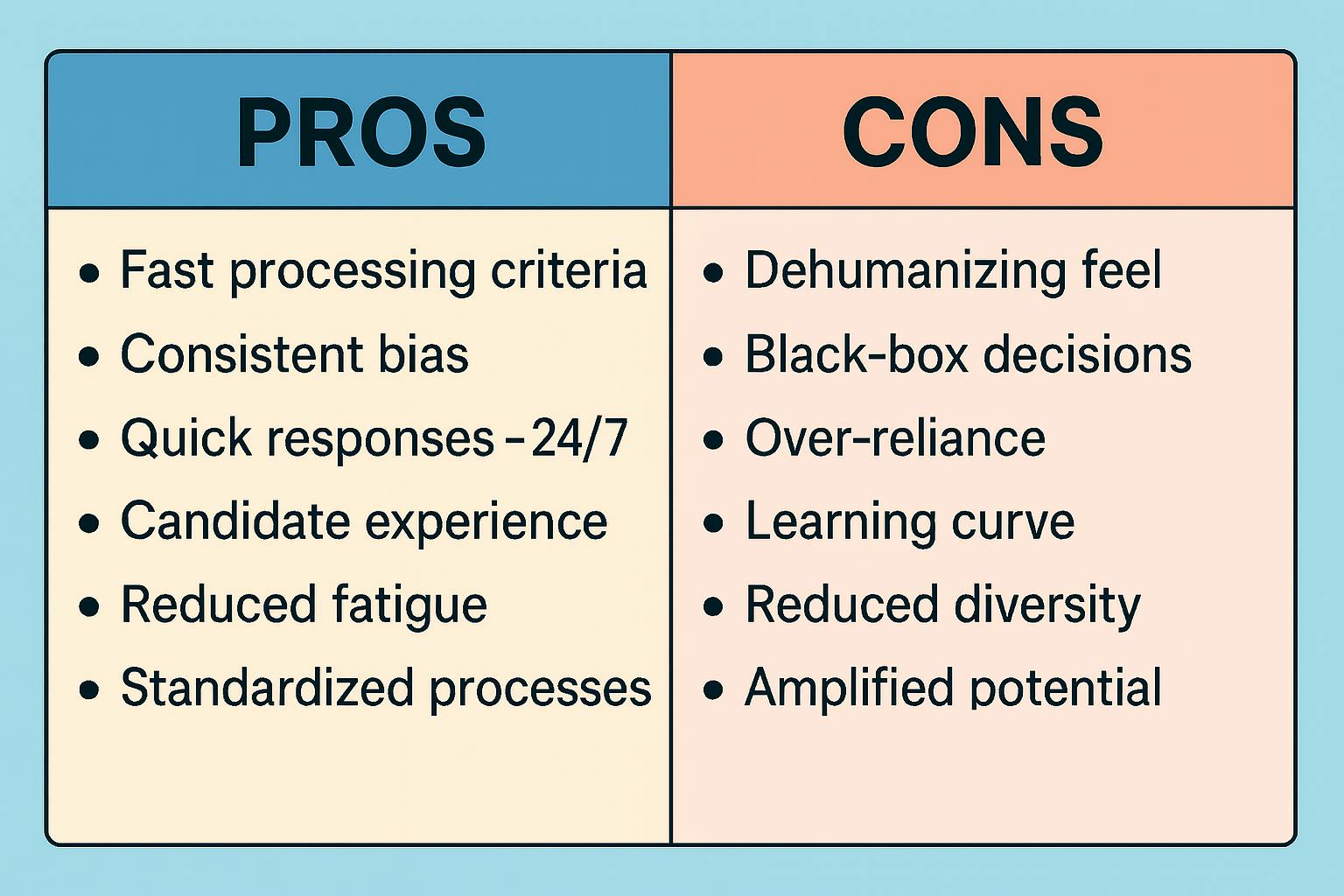 AI learns from historical hiring data, which means it can perpetuate or amplify existing biases. If your past hiring skewed toward certain schools, demographics, or backgrounds, AI will likely favor similar candidates in the future.
